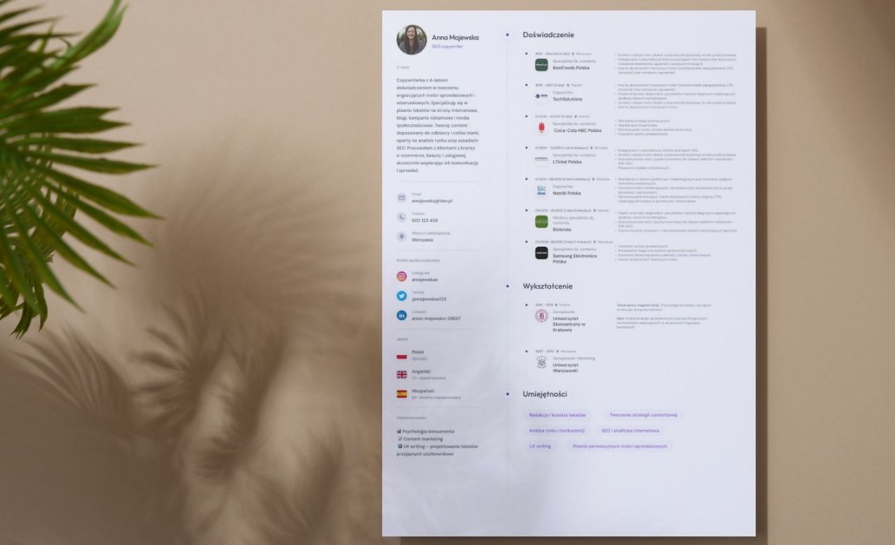 Jeśli chcesz znaleźć pracę jako copywriter, dobrze napisane CV jest Twoim najważniejszym narzędziem, a zaraz po nim list motywacyjny dla copywritera. To ono decyduje o tym, czy przejdziesz do kolejnego etapu rekrutacji. Chcesz stworzyć dokument, który przyciągnie uwagę rekrutera? CVersum pomoże Ci w tym. Zastanawiasz się, jak powinien wyglądać szablon CV dla copywritera? Warto pamiętać, […]